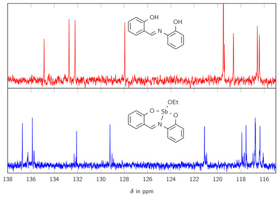 The 13C NMR spectra of the free ligand H2L (red) and the complex LSb (blue) in the range of 115 and 138 ppm.