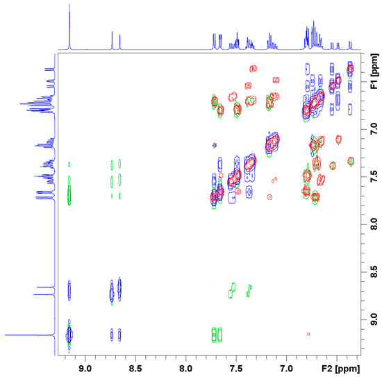 The 1D 1H and 13C NMR spectra thus indicate the formation of three similar complexes in solution. The possibility of the formation of a dimer was investigated by measuring the 2D COSY and NOESY spectra of the product. The COSY spectrum shows coupling hydrogen atoms and was also used for the assignment of the signals to the corresponding atoms. The NOESY spectrum shows spatially close hydrogen atoms (green) and interchanging hydrogen atoms (blue). To exclude close atoms in the same molecule, the COSY (blue and green) and NOESY (red) spectra were stacked. The resulting spectrum, shown in Figure 3, does not show any other close hydrogen atoms that are not in the same molecule. These results do not exclude any formation of dimers but any dimer with intermolecular close hydrogen atoms. Other dimers or oligomers could be, for example, oxo-bridged dimers with an Sb-O-Sb moiety. The formation of adducts with the solvent, in this case DMSO-d6, is unlikely because no signals for the coordinating DMSO-d6 molecules showed up in the 1D NMR spectra and no coupling of the DMSO-d6 signal with the complexes could be seen in the 2D NMR spectra.