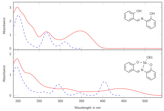 Because of the strong coloring of the product, it offered the investigation with UV/Vis spectroscopy. For comparison, the spectra of the free ligand H2L and the complex LSb were measured in dry acetonitrile. Furthermore, the spectra were calculated with quantum chemical methods. The spectra can be found in Figure 4.