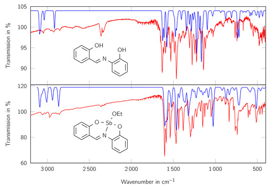 The calculated and measured spectra are in good consistency with each other. In both measured spectra the bands for aromatic CH vibrations at above 3000 cm−1 can be observed. Furthermore, at the complex more aliphatic CH vibrations are evident for the complex than for the free ligand, indicating the presence of an additional aliphatic component. The bands at about 600 cm−1 indicate the Sb-O bonds, because they cannot be seen in the free ligand and are in a similar range as Sb-O bonds known in literature [53]. The bands just below 800 cm−1, which can be seen in both spectra, indicate the presence of 1,2-disubstituated benzene derivatives. The signal at about 1580 cm−1 shows the presence of a C=N group, which is connected to an aromatic system.