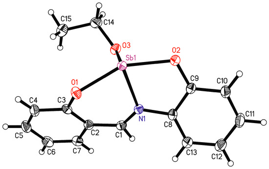 To pronounce Lewis acid and Lewis base properties, the ligand system has a significant influence. Hence, electron-withdrawing ligands increase the Lewis acidity of the antimony center [15]. As a flexible ligand system, Schiff bases can be used. Metal–Schiff-base complexes are quite common, e.g., [18,19,20,21,22,23,24]. These complexes have many different biomedical applications [25,26], as well as the use as catalysts (e.g., [10]), as sensors for copper [27], for use in non-linear optics [28], and for the generation of polynuclear magnetic complexes [29,30,31]. Despite these numerous examples of Schiff-base complexes, Schiff-base complexes of antimony without halide or carbon ligands have rarely been investigated [32].