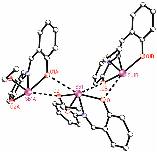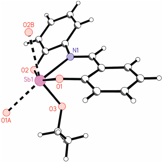 A closer inspection of the coordination polyhedron of the antimony atom including the contacts to the oxygen atoms O1A and O2B shows that a strongly distorted octahedral coordination around antimony is present in the solid-state structure (Figure 8). This can be seen, for instance, at the trans angles O1-Sb1-O2, N1-Sb1…O1A, and O3-Sb…O2B with values between 137.71(6) and 154.27(7)°, which are far away from 180°. A quantitative description of the distortion is possible using the parameters ζ, Σ, and Θ as defined by Ketkaew et al. [64]. These parameters give values very close to or equal to zero for a perfect octahedron, while in the present study the values are ζ = 2.25, Σ = 196.3, and Θ = 725.8.