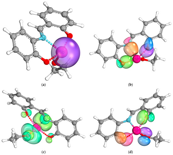 For further understanding of the bond situation in the complex, the IBOs [41] were calculated. The analysis shows a pronounced s-character of the lone pair of the antimony center (Figure 9a). Furthermore, the binding orbitals of the bonds between the heteroatoms of the ligands and the antimony center could be shown (Figure 9b). Both the Sb-N and Sb-O bonds show a covalent character, as expected from the molecular structure. It is interesting to note that they are not fully located between the two bonding partners but are slightly delocalized towards the neighbored carbon atoms. A similar behavior is shown by a pair of free electrons at each of the oxygen atoms of the tridentate ligand, as shown in Figure 9d. They are not fully located at the oxygen atoms, but delocalized between the antimony center, the oxygen atom, and the neighboring carbon atom. The electron pairs of the oxygen atom of the ethoxy moiety do not show such behavior. These results indicate a delocalization of electron density over the antimony center, which would explain the findings of the UV/Vis analyses. The electron system between the two phenyl rings in the ligand backbone is broken, which is also confirmed by this analysis (see Figures S5 and S6 in the Supplementary Material). Lastly, the lowest unoccupied intrinsic binding orbital is shown in Figure 9c in the bottom left. It is mainly localized at the antimony center, which speaks for the possibility of a nucleophilic attack on the antimony atom.