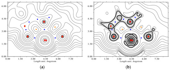 Electron density map (a) and Laplacian of the electron density (b) of the complex LSb in the O1-N-O2 plane. Bond critical points are shown in blue, ring critical points in orange. Full lines indicate positive values, dashed lines indicate negative values. The values of the contour lines for the electron density map (in e a0−3) and for the Laplacian of the electron density map (in Eh e−1) are 0.001, 0.002, 0.004, 0.008, 0.02, 0.04, 0.08, 0.2, 0.4, 0.8, 2, 4, 8, 20, 40, 80, 200, 400, and 800.