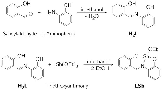 The investigated complex consists of a Schiff-base ligand derived from salicylaldehyde and o-aminophenol. This ligand (H2L) was reacted with triethoxyantimony (Sb(OEt)3) [53] to form the complex (LSb) under the release of two equivalents of ethanol (see Scheme 1).
