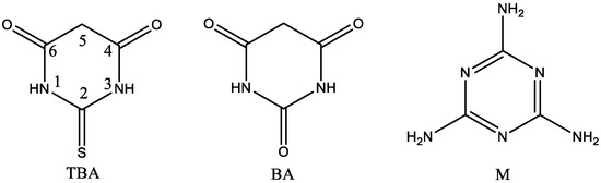 Thiobarbituric acid (TBA), barbituric acid (BA), and melamine (M) formulas are shown in Figure 1. TBA is well known as one of the reagents used for determining lipid peroxidation [6]. The presence of an acidic proton in the C5 position in its structure makes it a convenient substrate for various modifications, including amination [7] and Knoevenagel [8,9,10,11,12,13,14] reactions; at the same time, the presence of sulfur in the structure makes it possible to form complexes with metals [15,16], and the presence of carboxyl and amine groups allows the formation of intermolecular hydrogen bonds, which could be utilized to create multimodal supramolecular polymers with desired properties [17,18] and control crystallization [19].