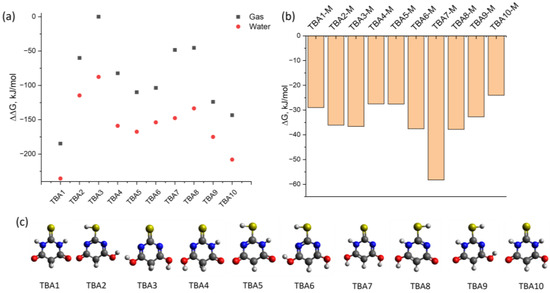 Since TBA can form different tautomers [12,15,49], we evaluated through quantum chemical calculations the Gibbs free energies of all possible tautomeric forms in the gas phase and aqueous solution (Figure 2a,c). Solvation reduces the relative Gibbs energy of formation. The difference between the most thermodynamically favorable (viz. TBA1 and TBA10) forms of TBA is 27.5 kJ/mol, thus it is clear that TBA1 prevails in the aqueous solution. However, one should not exclude the possibility of ketone-enol isomerization during the formation of crystals [21]. The calculation of TBA-M dimers (Figure 2b) showed that the formation of the M-TBA7 dimer (∆G = −47.66 kJ/mol) is most beneficial, which is much more profitable than the formation of the BA-M dimer (∆G = −40.9 kJ/mol) [29]. However, the geometry of this dimer does not fit into the structure determined by single crystal XRD. In addition, all TBA(9–10) tautomers are unsymmetrical, which reduces the likelihood of symmetrical patterns being formed.