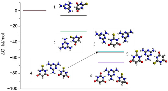 The calculation of the energy of the formation of dimers and trimers M-(BA)-TBA1 is shown in Figure 3. The least thermodynamically favorable is the formation of a dimer (compound 1, Figure 2a). In this case, the Gibbs energy of dimer formation (1) practically coincides with the Gibbs energy of the formation of a similar M-BA dimer, which indicates the absence of a noticeable effect of sulfur on the formation of hydrogen bonds between carboxyl groups and -NH2 of melamine. Compared to the BA-M dimer [29], the formation of M-TBA1 (compound 2) is less favorable (−27.00 kJ/mol), while the distance between the sulfur atoms in TBA and the hydrogen atom in melamine is 2.382 Å rather than 1.877 Å for a similar bond in the case of M-BA, and the length of the hydrogen bond between the NH2 of melamine and the carboxyl group of TBA1 is reduced to 1.839 Å (in the case of BA-M, the bond is 1.874 Å). Thus, the M and TBA molecules in this dimer are not in the same plane. The formation of trimer (5) turned out to be slightly more thermodynamically favorable than trimers (3) and (4). The trimer consisting of M-BA-TBA1 molecules (6) has a calculated Gibbs energy of formation equal to −65.97 kJ/mol, which indicates the possible incorporation of TBA into the M-BA structure. The decrease in Gibbs free energy during the formation of M-TBA1 aggregates, as compared to M-BA, can be attributed to the lower energy negativity of sulfur relative to oxygen [50,51].