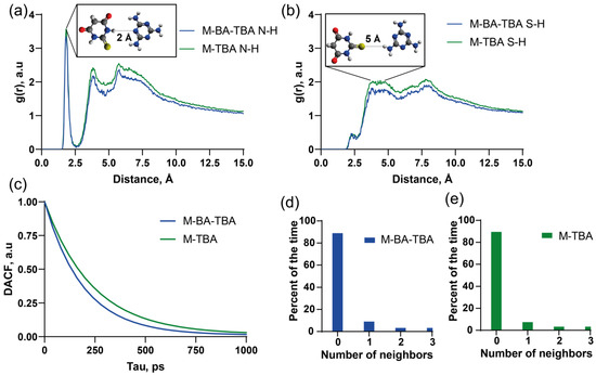 Figure 4 shows radial distribution functions (RDF), dimer existence autocorrelation functions (DACF), and neighbor counts for M-TBA and M-BA systems. Figure 4a depicts RDF for the intermolecular bonds between the H(N) atom of TBA and N atom of M. We can conclude that the most intense peak on the graph is at approximately 1.9 Å, which is in correspondence with the average length of the hydrogen bond between TBA and M. Alternatively, Figure 4b shows the RDF for intermolecular bond between S atom of TBA and H(N) atom of M. There are no peaks at the distance corresponding to hydrogen bonds. Therefore, all hydrogen bonds between M and TBA molecules are represented by H(N)-TBA and N-BA hydrogen bonds. Figure 4c shows the DACF for system with and without BA molecules—in other terms the lifetime of the M-TBA dimers. The inclusion of BA molecules in the system slightly decreases the lifetime of M-TBA dimes, due to the competitive process of M-BA dimer formation. Figure 4d,e depicts the neighbor count of M-TBA for the M-BA-TBA system and M-TBA system, respectively. There are almost no changes in the neighbor count for systems with and without inclusion of BA.