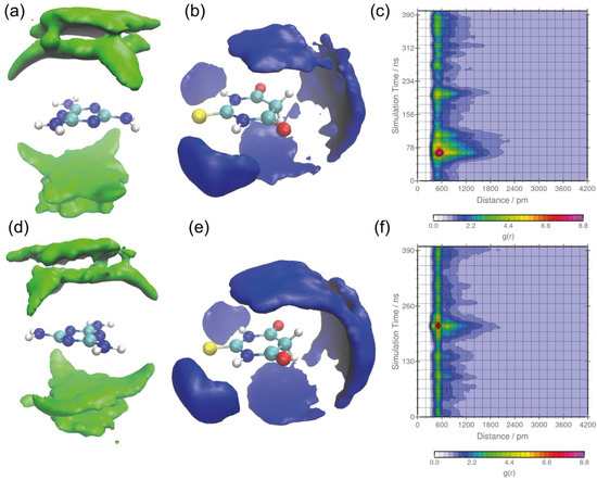 Data in Figure 5a,b,d,e represent the spatial distribution function between M and TBA molecules with and without the inclusion of BA molecules. For both types of systems one can conclude that the M-TBA dimer forms both by π–π stacking and hydrogen bonds. In correspondence with the RDF data, the hydrogen bonds only form between the H(N) atom of TBA and N atom of M.