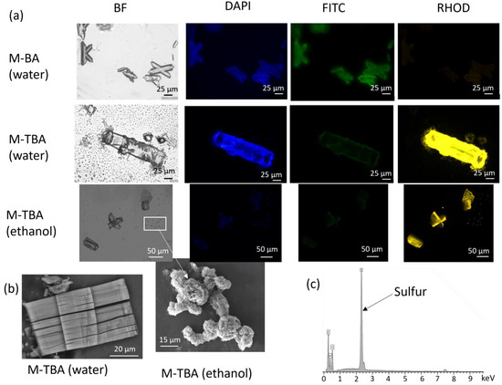 The data from the theoretical calculations were also confirmed experimentally: at room temperature, the self-assembly of thiobarbiturate and melamine did not form spontaneously from saturated solutions of TBA and M. To obtain M-TBA crystals, a solution containing 10 mmol of TBA and 10 mmol of M was boiled, evaporating 80% of the water. At the same time, no visible signs of crystal precipitation were observed; on the second day, rhombic crystals precipitated, which could be identified as melamine crystals. A few days later, pink crystals precipitated, having a lamellar structure (Figure 6a); less often “hedgehogs” and fluorescing in the DAPI and RHOD ranges (Figure 4a). At the same time, M-BA fluoresced in the DAPI and FITC ranges [30]. From the SEM images (Figure 6b), M-TBA had a layered structure, and the EDX analysis showed the sulfur content in the sample (Figure 6c). Recrystallization of M-TBA crystals from ethanol formed rose-type structures, the dimensions of which were much smaller than those of the M-TBA crystals formed in water. As well as the crystals obtained from an aqueous solution, these agglomerates had fluorescence in the DAPI and RHOD ranges.