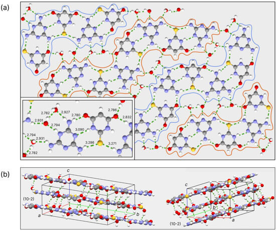 We succeeded in isolating and characterizing a single M-TBA crystal. The parameters and volume of the crystal cell are shown in Table 1. Only one tautomeric form of TBA was found in the studied crystal. Apparently, this is because the TBA1 tautomer predominates in the aqueous phase. In the crystal structure of TBA-M, TBA and M molecules are combined into dimers of two types, through three type of hydrogen bonds: N–H…O (2.78 Å), N–H…N (3.09 Å), and N–H…S (3.29 Å) (Figure 7a). Dimers are similar in composition and the structure differs only in the location geometry. The dimers alternate and combine directly through N–H…S (3.27 Å) and N–H…O (2.83 Å) hydrogen bonds, forming two types of ribbons (highlighted in blue and orange in Figure 7a). The ribbons are connected to each other into layers by N–H…O (2.93, 2.79, and 2.93 Å) and O–H…O (2.79 Å) hydrogen bonds through water molecules. These layers correspond to the (10-2) plane. Water molecules are linked by hydrogen bonds (O–H…O) with a length of 2.78 Å. The layers are also connected to each other through water molecules by hydrogen bonds of the O–H…O type, 2.73 and 2.79 Å long (Figure 7b). Thus, the cracks in the SEM images (Figure 6b) can be associated with the release of water from the structure during the vacuumization of the sample.