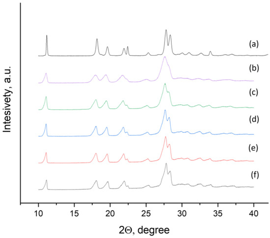 Using the PXRD method, it was established (Figure 8) that the structure of these supramolecular assemblies coincided with the initial M-BA. At the same time, with an increase in the concentration of TBA, the crystallinity parameter decreased. Samples obtained by diffusion control had the highest crystallinity. However, the lattice parameters differed slightly in M-BA, and the volume of the crystal lattice increased from 971.9 Å2 to 1006.7 Å2. Apparently, this was due to an increase in the distance, due to the complexity of the formation of a hydrogen bond between the TBA sulfur and the hydrogens of the melamine amino groups. Thus, TBA changes the morphology and shape of M-BA crystals.