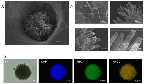 All crystals glow in fluorescent channels (RHOD, FITC, and DAPI). The EDX spectrum shows the presence of sulfur in the sample (Supplementary Materials).