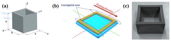 The investigated sample was fabricated in the form of a hollow square for two main reasons: (i) to maximize the success rate of solvent debinding, thermal debinding, and sintering and (ii) to simplify the fixing and cutting phases. The schematic of the 3D-printed sample is reported in Figure 1a and the indicated dimensions are as follows: h = 50 mm, s = 5 mm, a = 50 mm, b = 50 mm.