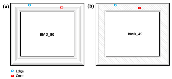 Two different sets of two hollow square samples were fabricated by maintaining the same processing parameters and using a different deposition strategy in terms of infill direction with respect to the 3D-printed perimeter wall (Figure 2):