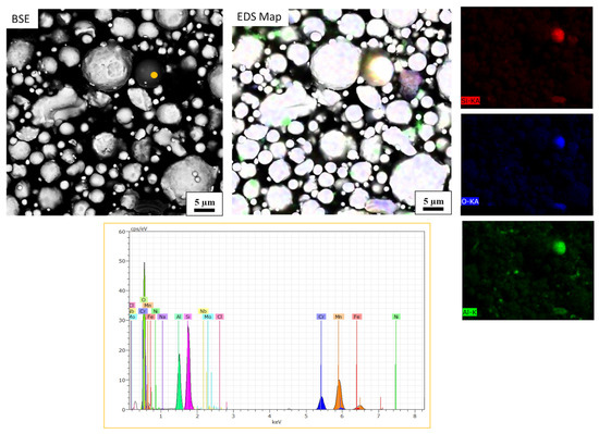 BSE micrograph and EDS elemental map of silicon and oxygen in the 17-4PH composite feedstock. The reported EDS spectrum was acquired in the orange dot position. Different colors of the EDS map correspond to Silicon (red), Oxygen (blue), and Aluminum (green).