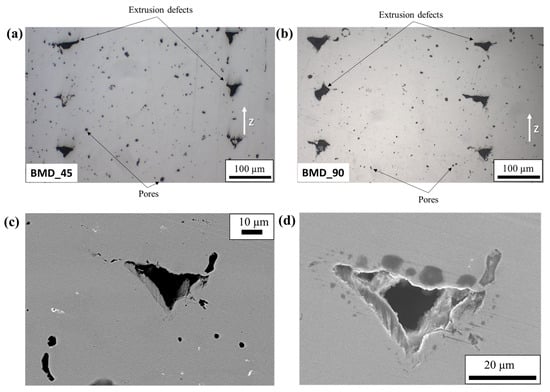 Optical micrographs of the YZ samples: (a) BMD_45, (b) BMD_90, and SEM-BSE micrographs of the mirror-polished YZ surface (BMD_90): (c) low magnification image with low brightness–high contrast balance to highlight the brightest inclusions, (d) high magnification image with high brightness–mid contrast balance to highlight the darker areas surrounding the extrusion-related pore.