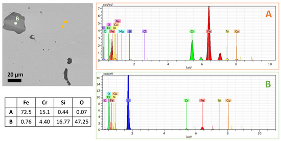 The BSE signal allowed for the highlighting of differences in the chemical composition of the final part (Figure 8) and the use of the energy dispersive microanalysis performed on specific positions (being A the matrix and B the discontinuity) allows identifying the presence of an inclusion rich in silicon and oxygen. It resulted that particles with a high amount of O, Si, Al, and Mn were found inside the metal-powder feedstock (Figure 5) and these are likely to be the cause of the inclusions reported here in Figure 8, with an associated redistribution of alloying elements during surface and volumetric diffusion occurring in the sintering furnace. These oxide particles are also responsible for the darker BSE contrast areas in Figure 6d and highlight how their concentration is particularly remarkable near extrusion-related pores.