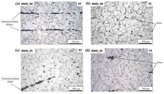 The optical micrographs of the BMD_45 and BMD_90 XY mirror-polished samples are shown in Figure 7.