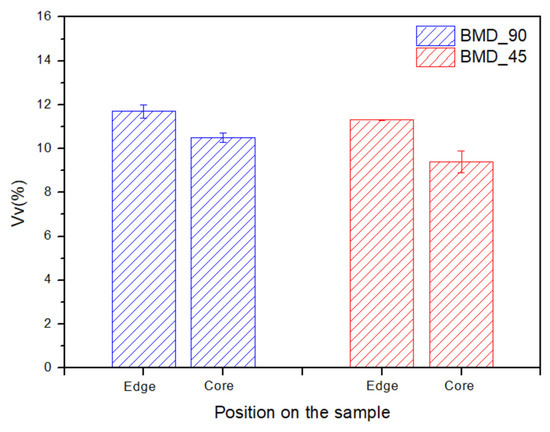 The δ-ferrite volume fraction resulting from phase quantification (ASTM E562) on the edge and on the core of both the BMD_90 (blue bars) and BMD_45 (red bars) samples. The error bar of the BMD_45 edge condition is very thin and overlaps with the contour of the bar itself.