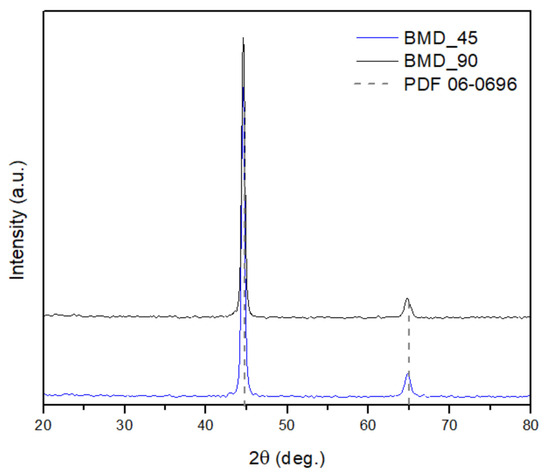 The X-ray diffraction patterns of the BMD_45 (black line) and BMD_90 (blue line) samples reported in Figure 11 were acquired along the growth direction (YZ plane). The gray dashed lines identify the δ-ferrite peak positions, corresponding to the PDF card 06-0696. No peaks related to the fcc γ-iron phase are visible in the acquired patterns [26].