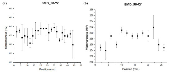HV microhardness profiles (300 gf) of the BMD_90 sample collected: (a) on the growth direction (plane YZ) and (b) on the XY plane.
