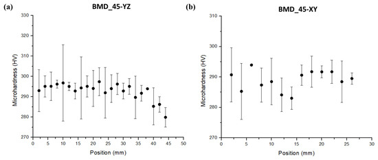 HV microhardness profiles (300 gf) of the BMD_45 sample collected: (a) and on the growth direction (plane YZ) and (b) on the XY plane.