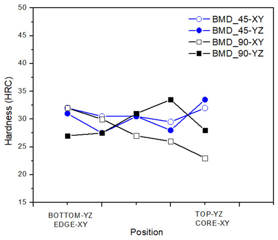 The Results obtained for the BMD_45 and BMD_90 samples, and shown in Figure 14, refer to top-to-bottom YZ plane and to edge-to-core XY plane. The decrease of HRC values for the BMD_90 YZ sample suggests a local anchoring effect of the interface ceramic layer and the raft, which keeps the sample in a fixed position during the furnace sintering. This effect is remarkably influenced by the infill deposition strategy within the first fabricated layers since it is not relevant in the BMD_45 YZ sample nor in the rest of the two YZ samples. A comparison of the obtained values with the literature confirms that this solid-state AM technology is outperforming MIM (ca. 27 HRC, in the as-sintered condition [23]). In particular, comparing experimental values with the literature results concerning other material extrusion AM processes, such as fused filament fabrication (22 HRC [51] to 26 HRC [27]), the performance improvement due to the higher metal-to-binder ratio of the BMD feedstock is remarkable.