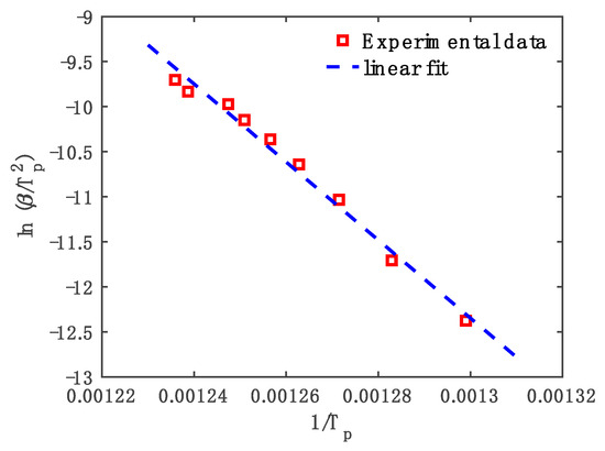 Kissinger’s method is often used to analyze the correspondence between the DSC peak shift and the heating rate to extract an overall activation energy of a thermally activated process (e.g., chemical reaction or phase transformation) [19,20,21]. This method is based on the first-order chemical reaction model and, more specifically, the following equation: