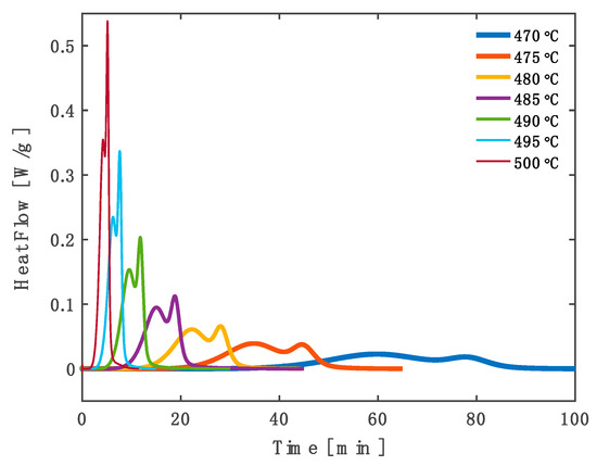 Crystallization signals (exothermic) recorded in isothermal DSC scans of as-cast specimens at seven different temperatures.