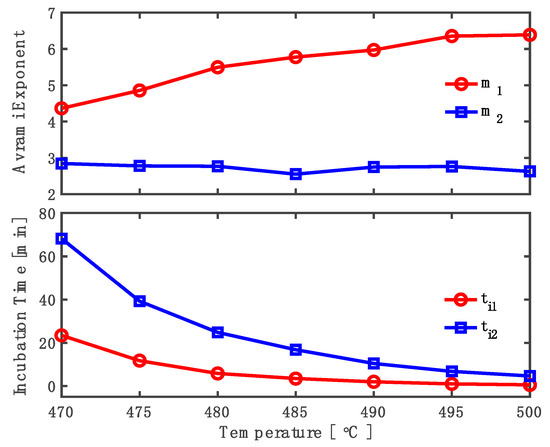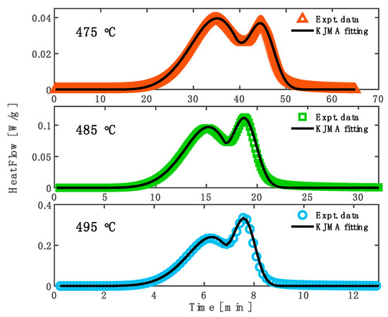 The two-event KJMA model fit the data very closely, with R2 > 0.99 achieved for all seven temperatures. Examples of the fitted curves (the normalization factor, i.e., the total enthalpy of crystallization, reapplied for plotting) vs. experimental data are presented in Figure 4 with T = 475, 485, and 495 °C. The fitting results for the seven different temperatures are tabulated in Table 1. The fitted Avrami exponents (, ) and incubation times (, ) of the primary and secondary crystallization events are plotted in Figure 5. As seen in Table 1 and Figure 5, the incubation time decreased with increasing temperature for both events. At 470 °C (16 °C above the glass transition temperature), the incubation time was rather long: 23.4 min for the primary event and 68.2 min for the secondary event. At 500 °C, it became significantly shorter: 0.5 min and 4.6 min for the primary and secondary events, respectively.