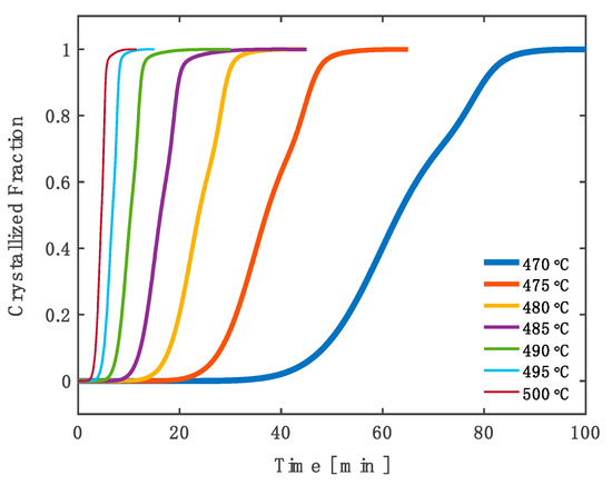 Cumulative transformation curves derived from the isothermal DSC scans at seven different temperatures.