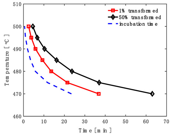 Time–temperature–transformation (TTT) diagrams derived from the cumulative transformation curves.
