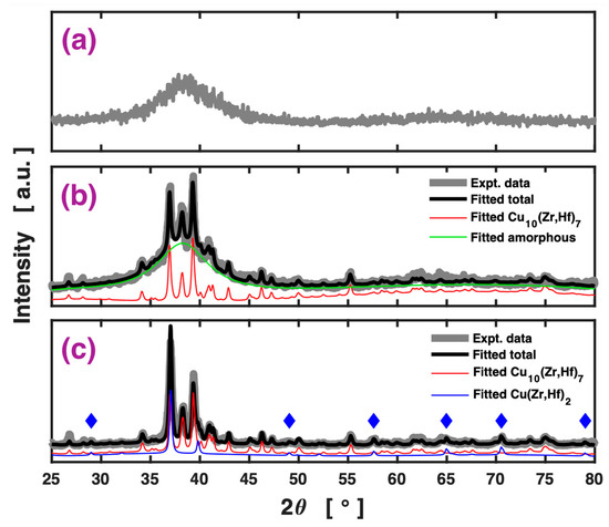 The thick gray line in Figure 8c is the XRD pattern obtained from the specimen isothermally annealed inside the calorimeter at 475 °C for 65 min. According to the isothermal DSC data, this annealing time was longer than it took for both primary and secondary crystallization events to complete at this temperature (see Figure 3). Thus, this specimen was expected to be fully crystallized and comprise both primary and secondary crystal phases. Indeed, the XRD pattern exhibited no appreciable amorphous component, confirming that the specimen was fully crystallized. The Rietveld refinement found a few new peaks (positions marked with blue diamonds) that could not be reproduced using the primary phase Cu10(Zr,Hf)7. These new peaks were found to agree with the Cu(Zr,Hf)2 phase (space group 139, I4/mmm, tetragonal lattice). By considering both the Cu10(Zr,Hf)7 and the Cu(Zr,Hf)2 phases, the whole XRD pattern was found to be well-fitted. The fitting also suggested that the secondary phase Cu(Zr,Hf)2 contributed to the main diffraction peaks near 37° and 39.3° in addition to the marked new peaks.