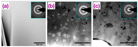 The TEM image of the specimen annealed at 475 °C for 34 min in Figure 9b exhibited nearly equiaxed crystals of various sizes embedded in a featureless matrix. The corresponding overall SAED pattern was composed of both diffuse amorphous rings and discrete spots from crystal grains. Both the image and the diffraction pattern confirm the glass–crystal composite structure of this partially crystallized specimen, consistent with the XRD data in Figure 8b.