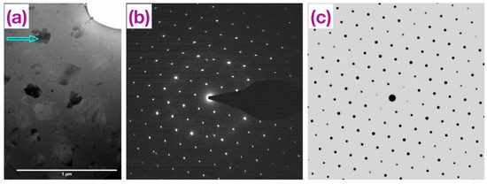 (a) TEM bright-field image of the specimen annealed at 475 °C for 34 min; (b) single-crystal-like SAED pattern taken from the grain pointed out by the arrow in (a); (c) simulated electron diffraction pattern of Cu10Zr7 with the zone axis [0 1 1] (ICDD database PDF Card #01-082-3014).