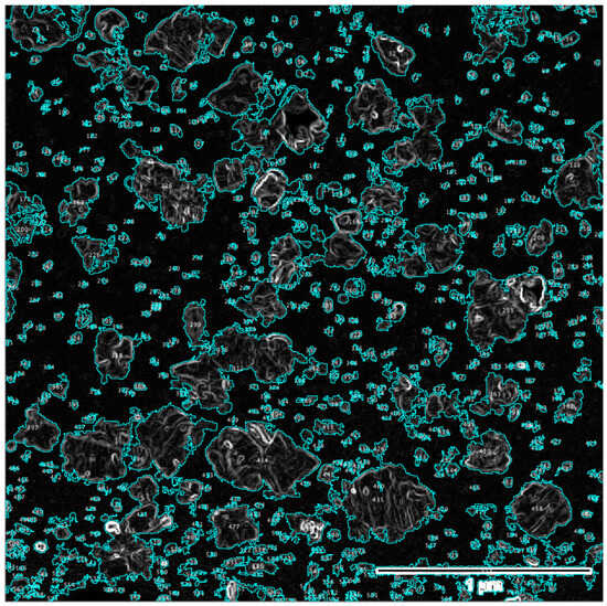 Finally, we made some broad estimates of number density and nucleation and growth rates of the primary crystals based on the TEM image (Figure 9b) of the specimen annealed at 475 °C for 34 min. The open-source program ImageJ [34] was used to perform particle (here, crystal grains) analysis of the TEM image. The identified grains are shown in Figure 12, the total number of which was 599. The areal fraction of the identified grains with respect to the entire image is 27%. According to the cumulative transformation curves in Figure 6, the transformed fraction corresponding to 34 min at 475 °C is 34%. These two fractions are in quite good agreement, especially if one considers the differences between the area-based statistics in the 2-D image analysis here and the heat-based (close to but not exactly the same as 3-D volume-based) statistics in the DSC data analysis.