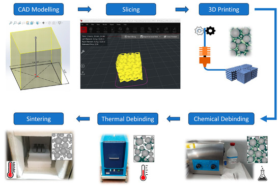 After printing the polymer ceramic mixture, the polymer binder must be removed, which involves two debinding steps. The first is a chemical debinding, which removes most of the polymeric mixture, and the second is a thermal debinding, which slowly removes the remaining polymer. For the chemical debinding, the green parts were immersed in an acetone bath at 40 °C for 2 h, as this process stage aims at removing most of the binding material, which corresponds to a weight loss of approximately 5% in weight after drying. The thermal debinding was then performed at around 500 °C, lasting up to 30 h. The production process was completed by sintering the green cubes in a MoSi2 heating element electric furnace at 1500 °C with a holding time of 1.5 h using a heating rate equal to the cooling one set at 5 °C min−1 and reaching a total of 10 h. The scheme shown in Figure 1 highlights the steps required for producing Black Zirconia parts, from the modeling of the samples to the final sintering stage.
