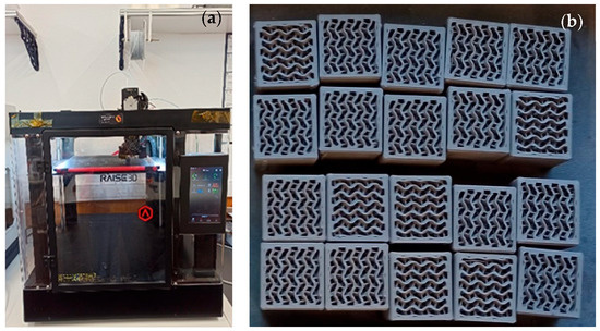 The machine used to produce the green cubes was a Raise3D dual extruder Pro 2 printer (Figure 2a). The machine has a direct drive extrusion system on which a wear-resistant nozzle was mounted. The slicer software used to prepare the print files was IdeaMaker 4.2.3.
