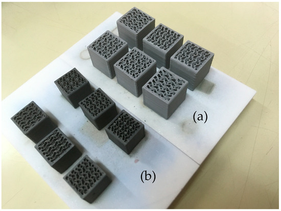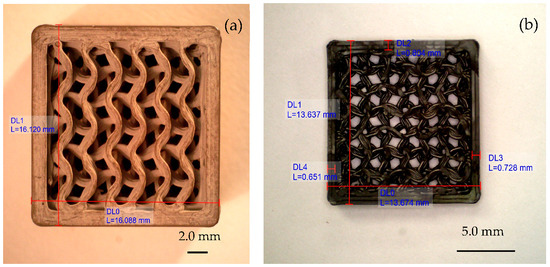 After sintering, the measured linear shrinkage was around 19% (Figure 4). For this reason, an equivalent scale factor was considered during the cubes’ design and modeling stages of the components. After sintering, the measured mean value of the cube’s edges was 13.1 ± 0.6 mm, and 38 cuboid samples were produced.