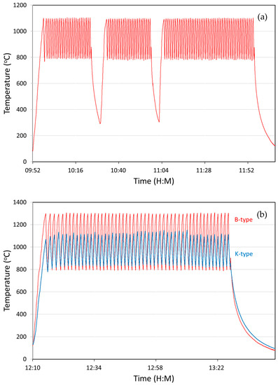 Temperature profiles for ΔT = 300 K (25 + 25 + 50 cycles) using a B-type thermocouple (a) and ΔT = 500 K (50 cycles) using B-type and K-type thermocouples (b).