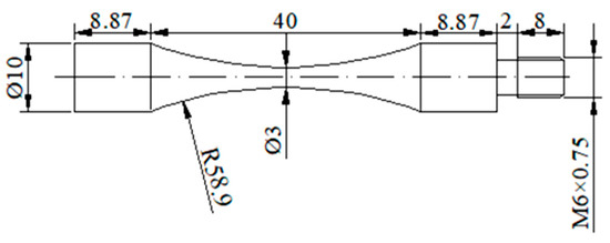 Based on the elastic wave theory, the specimen was designed to work at resonance with the amplifier, and the geometries of the fatigue specimens are shown in Figure 1. According to Figure 1, the ultrasonic fatigue specimens were processed from the EBM parts. Thus, the rough surface of the EBM parts was removed by mechanical processing.