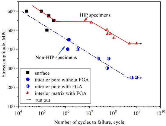 Under high-stress amplitude, small pore defects were irrelevant to fatigue crack initiation, and the non-HIP specimens exhibited the surface crack initiation behavior (Figure 4a), and the slip band activity resulted in crack initiation. Fatigue crack initiated at the pore inside the specimens under low-stress amplitude. Stage I propagation along the facet was presented around the large pore under a 450 MPa stress amplitude (Figure 4b), while FGA was observed around the pore under a lower stress amplitude (Figure 4c,d). Figure 6 showed that the areas of the pore ranged from 100 µm2 to 3840 µm2, and there was no direct relationship between the area of the pore and fatigue life Nf. However, the area of FGA increased with fatigue life Nf. As FGA was formed by the discontinuous propagation of microcracks [6], it indicated that the consumption life in FGA was a major part of fatigue life.