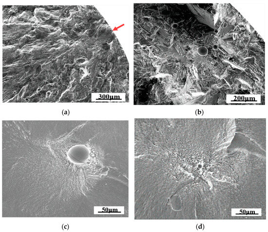 For EBM materials, insufficient energy input resulted in incomplete melting of the powder and LoF, whereas excessive energy input led to an unstable molten pool and vaporization, forming pore defects. As for the non-HIP specimens, the pore defects had a significant impact on the fatigue crack initiation characteristics for the EBM TC21 titanium alloy. Figure 4a shows that under 600 MPa stress amplitude, a crack initiated from the specimen surface without pore defects at the initiation site, as indicated by the red arrow. When the stress amplitude decreased to 450 MPa, fatigue cracks initiated at a large pore inside the specimen (Figure 4b), where stage I propagation along the facet was observed near the pore. Under lower stress amplitude, fatigue cracks initiated at a small pore inside the specimen, and a fish-eye characteristic and FGA were observed near the pore (Figure 4c), which was a typical characteristic of VHCF of titanium alloys [6,7] and were consistent with that of the EBM Ti6Al4V alloy and SLM Ti6Al4V in the investigation by Günther [14]. It should be noted that even if the equivalent diameter of small pores in the EBM TC21 titanium alloy decreased to 12 µm, these small pores still promoted the VHCF crack initiation, and there were FGA characteristics around the pores (Figure 4d).