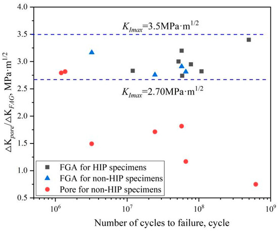where σa is the stress amplitude and is the area of the pore at the crack initiation site. As for FGA, ΔKFGA can be calculated by substituting into Equation (1).