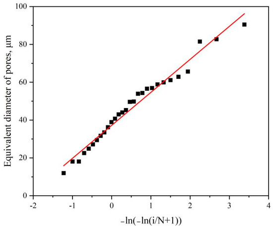 To quantitatively analyze the fatigue strength of the EBM titanium alloy with pore defects, the maximum pore size on the fracture surface was estimated by the statistical extreme value method. The pore sizes were assumed to follow the Gumbel distribution [31], and the pore size of EBM titanium alloys was plotted using the Gumbel extreme value analysis. In Figure 8, i/(N + 1) was the cumulative probability corresponding to the maximum pore size in each field of view and arranged in descending order. The maximum pore diameter of the EBM titanium alloy was evaluated as 96.2 μm.