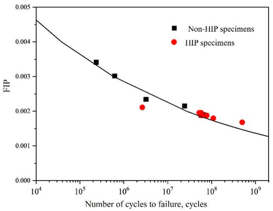 The fitting curve between FIP parameters and fatigue life is shown in Figure 9. It showed that the prediction of fatigue life based on Equation (4) agreed well with the experimental data. The HIP specimens had a lower value of FIP and higher fatigue life than those of the non-HIP ones.