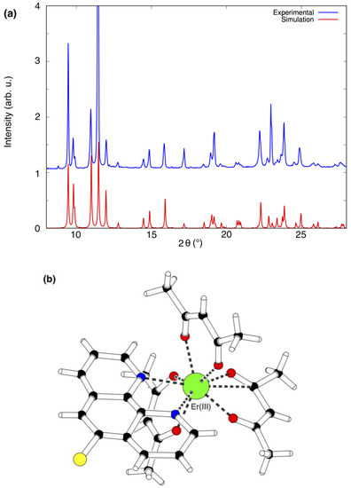 (a) Experimental powder XRD patterns for the erbium(III) complex in comparison to the calculated pattern for the structure determined by single-crystal XRD (for clarity, the experimental data were offset by one unit along the vertical axis). (b) Er(acac)3(cphen) complex, showing the eightfold coordination of the rare-earth ion via the N and O atoms of the ligands (atom colors: Er(III)—green, O—red, N—blue, C—black, Cl—yellow, H—white).