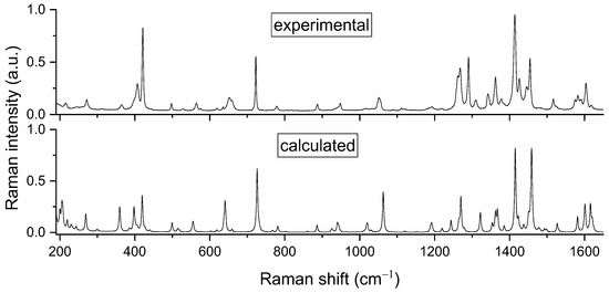 Experimental and calculated Raman spectra of Er(III) complex. The calculated spectrum was scaled by a factor of 1.02.